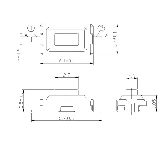尺寸: 6.1X3.7mm 產(chǎn)品分類: 輕觸開關(guān) - B系列 / 3x6一型二型 應(yīng)用 ※ 用于各種電子設(shè)備操作 ※ 音頻設(shè)備,辦公設(shè)備,通訊設(shè)備 ※ 測(cè)量?jī)x器,電視機(jī),電視錄像機(jī)等 特點(diǎn) ※ 高可靠的觸點(diǎn)封裝結(jié)構(gòu) ※ 大的按鈕表面提高安裝速度 ※ 回流可焊