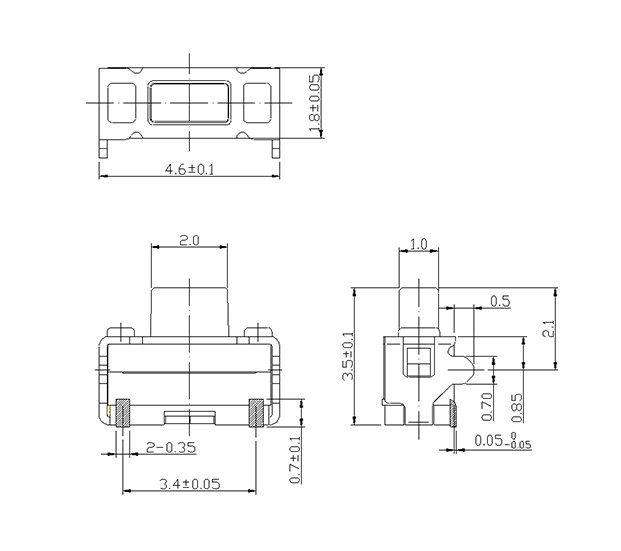 尺寸: 4.6X2.4mm 產品分類: 輕觸開關 - A系列 / 迷你型 應用 ※ 用于操作各種移動設備 ※ 用于操作各種需要高密密安裝的設備 ※ 如手機,通訊設備,緊湊的電子設備 ※ 電子設備 特點 ※ 提高PCB組件的安裝密度 ※ 回流可焊 ※ 觸點完全封裝,提高可靠性 ※ 可以帶接地用于靜電釋放 ※ 用12mm寬的編帶包裝