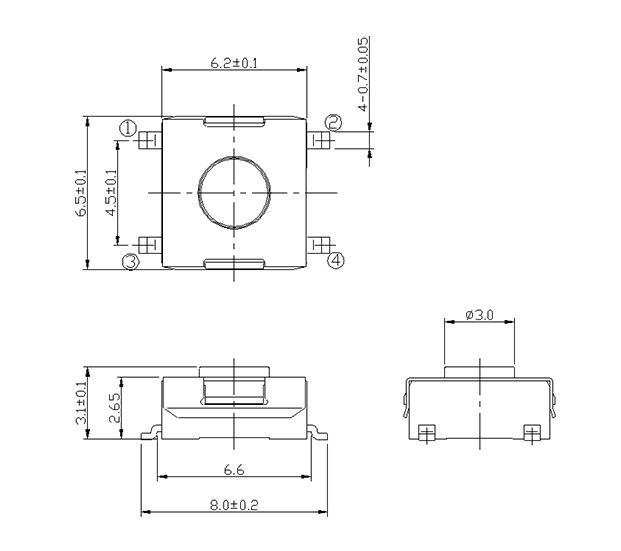 尺寸: 6.2X6.2mm 產(chǎn)品分類: 輕觸開關(guān) - E系列 / 6.2x6.2 應(yīng)用 ※ 各種電子設(shè)備像音響設(shè)備,辦公設(shè)備,通訊設(shè)備,測試儀器,電視機,錄像機,汽車等 特點 ※ 回流可焊 ※ 可做防靜電接地腳 ※ 用16mm寬的印花編帶包裝 ※ 用于高速SMT處理