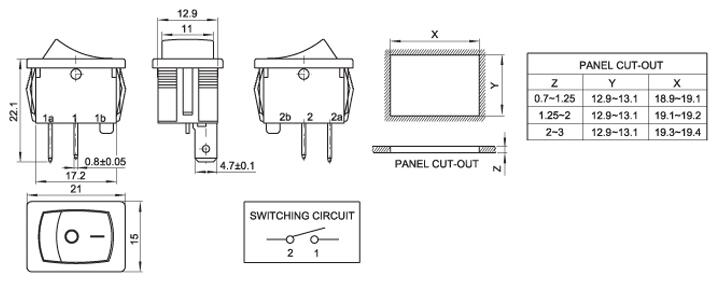 15*21二檔二角 船型開關(guān) 蹺板開關(guān) IO電源開關(guān) 1.額定工作電壓、電流Rating 3A/6A/15A 250V 2.使用溫度范圍Temperature -25+85℃ 3.接觸電阻Contact Resistance <0.03Ω 4.動(dòng)作力Actuating Force 1.3+0.5N 5.絕緣電阻Insulation Resistance >100MΩ 6.壽命(switching Life) 10000次