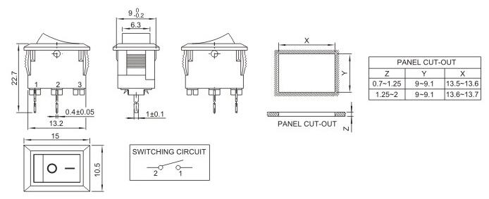 10*15 船型開關 蹺板開關 IO電源開關 1.額定工作電壓、電流Rating 3A/6A/15A 250V 2.使用溫度范圍Temperature -25+85℃ 3.接觸電阻Contact Resistance <0.03Ω 4.動作力Actuating Force 1.3+0.5N 5.絕緣電阻Insulation Resistance >100MΩ 6.壽命(switching Life) 10000次