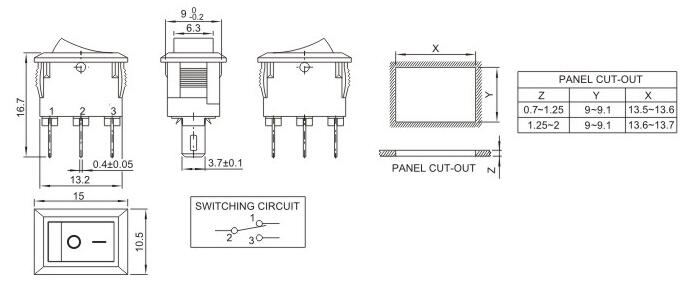 10*15 船型開關(guān) 蹺板開關(guān) IO電源開關(guān) 1.額定工作電壓、電流Rating 3A/6A/15A 250V 2.使用溫度范圍Temperature -25+85℃ 3.接觸電阻Contact Resistance <0.03Ω 4.動(dòng)作力Actuating Force 1.3+0.5N 5.絕緣電阻Insulation Resistance >100MΩ 6.壽命(switching Life) 10000次