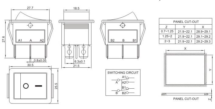25*30.5 船型開關 蹺板開關 IO電源開關 1.額定工作電壓、電流Rating 3A/6A/15A 250V 2.使用溫度范圍Temperature -25+85℃ 3.接觸電阻Contact Resistance <0.03Ω 4.動作力Actuating Force 1.3+0.5N 5.絕緣電阻Insulation Resistance >100MΩ 6.壽命(switching Life) 10000次