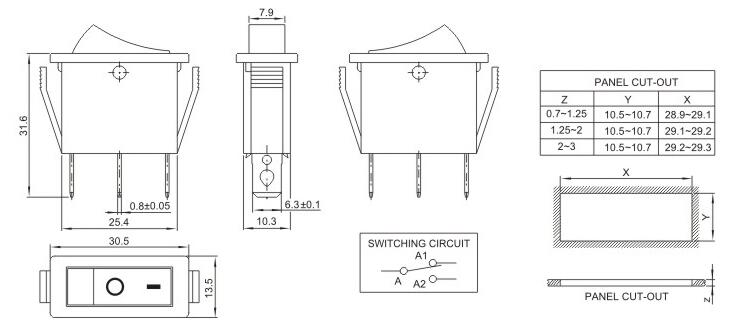 13*30.5 船型開關(guān) 蹺板開關(guān) IO電源開關(guān) 1.額定工作電壓、電流Rating 3A/6A/15A 250V 2.使用溫度范圍Temperature -25+85℃ 3.接觸電阻Contact Resistance <0.03Ω 4.動作力Actuating Force 1.3+0.5N 5.絕緣電阻Insulation Resistance >100MΩ 6.壽命(switching Life) 10000次