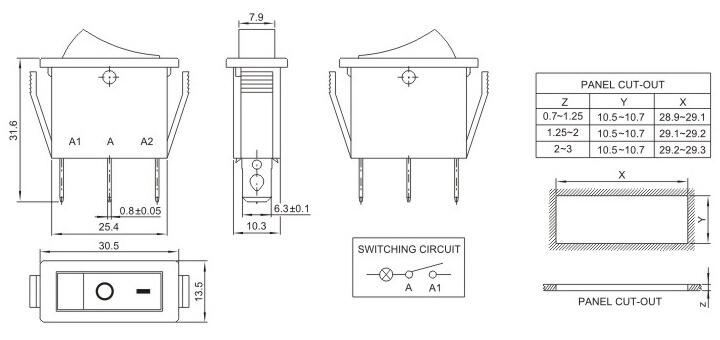 13*30.5 紅色帶燈 船型開關 蹺板開關 IO電源開關 1.額定工作電壓、電流Rating 3A/6A/15A 250V 2.使用溫度范圍Temperature -25+85℃ 3.接觸電阻Contact Resistance <0.03Ω 4.動作力Actuating Force 1.3+0.5N 5.絕緣電阻Insulation Resistance >100MΩ 6.壽命(switching Life) 10000次