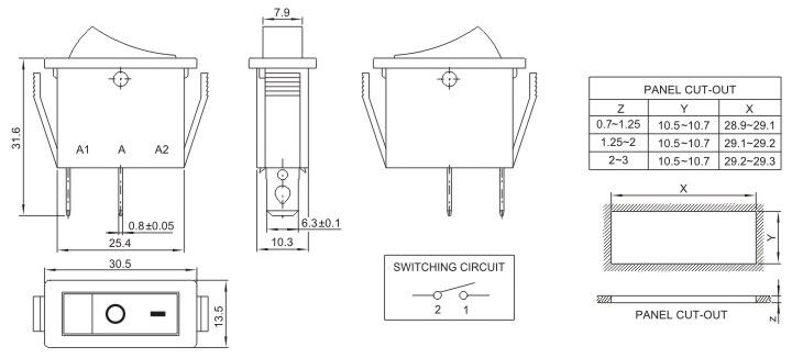 13*30.5 船型開關(guān) 蹺板開關(guān) IO電源開關(guān) 1.額定工作電壓、電流Rating 3A/6A/15A 250V 2.使用溫度范圍Temperature -25+85℃ 3.接觸電阻Contact Resistance <0.03Ω 4.動作力Actuating Force 1.3+0.5N 5.絕緣電阻Insulation Resistance >100MΩ 6.壽命(switching Life) 10000次